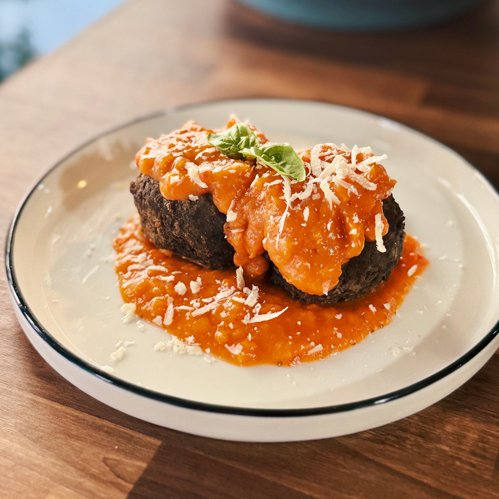 Ingredients: organic beef, organic eggs, organic sweet potato, organic strawberry, organic parsley, organic Parmesan cheese, organic basil.