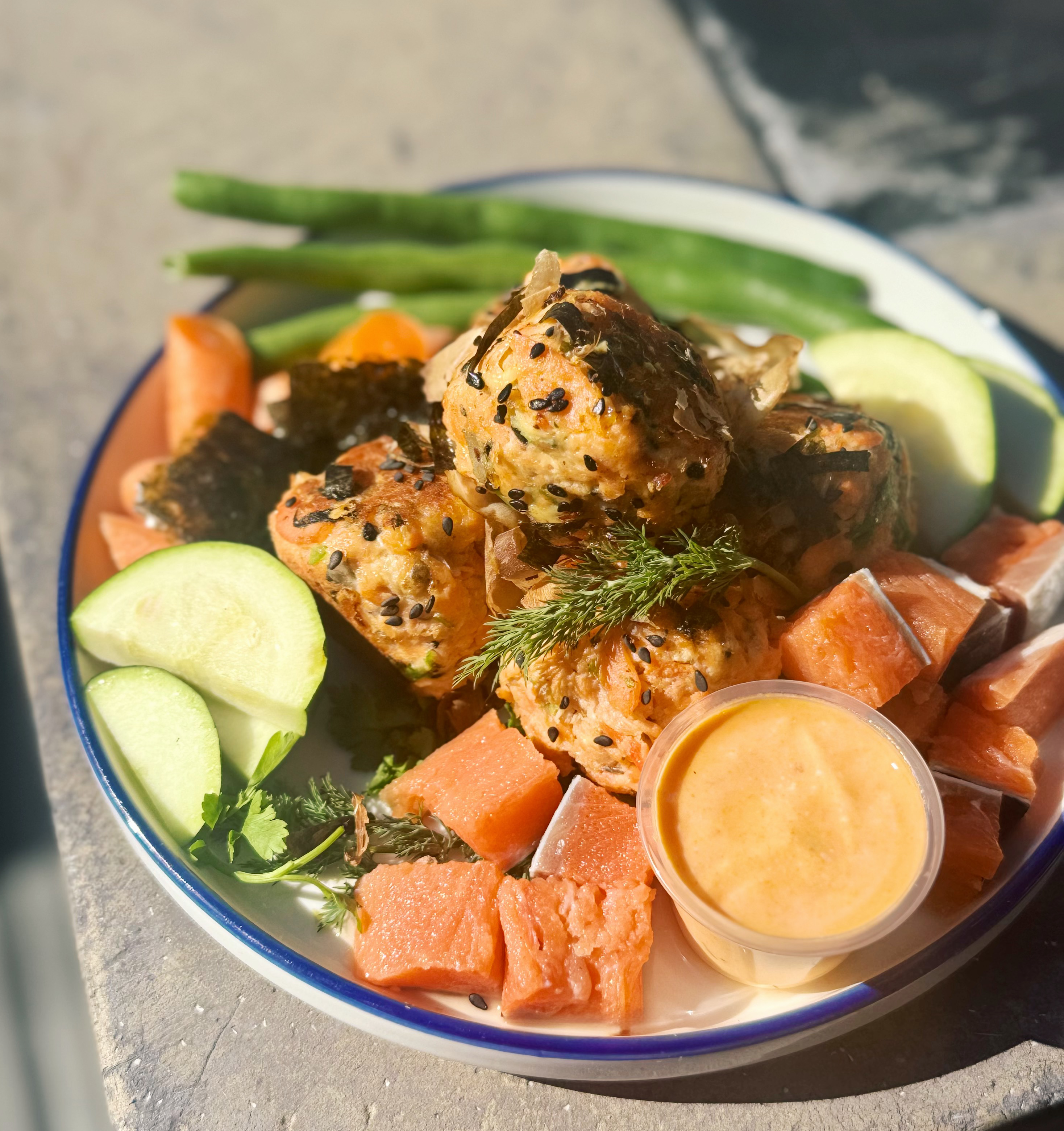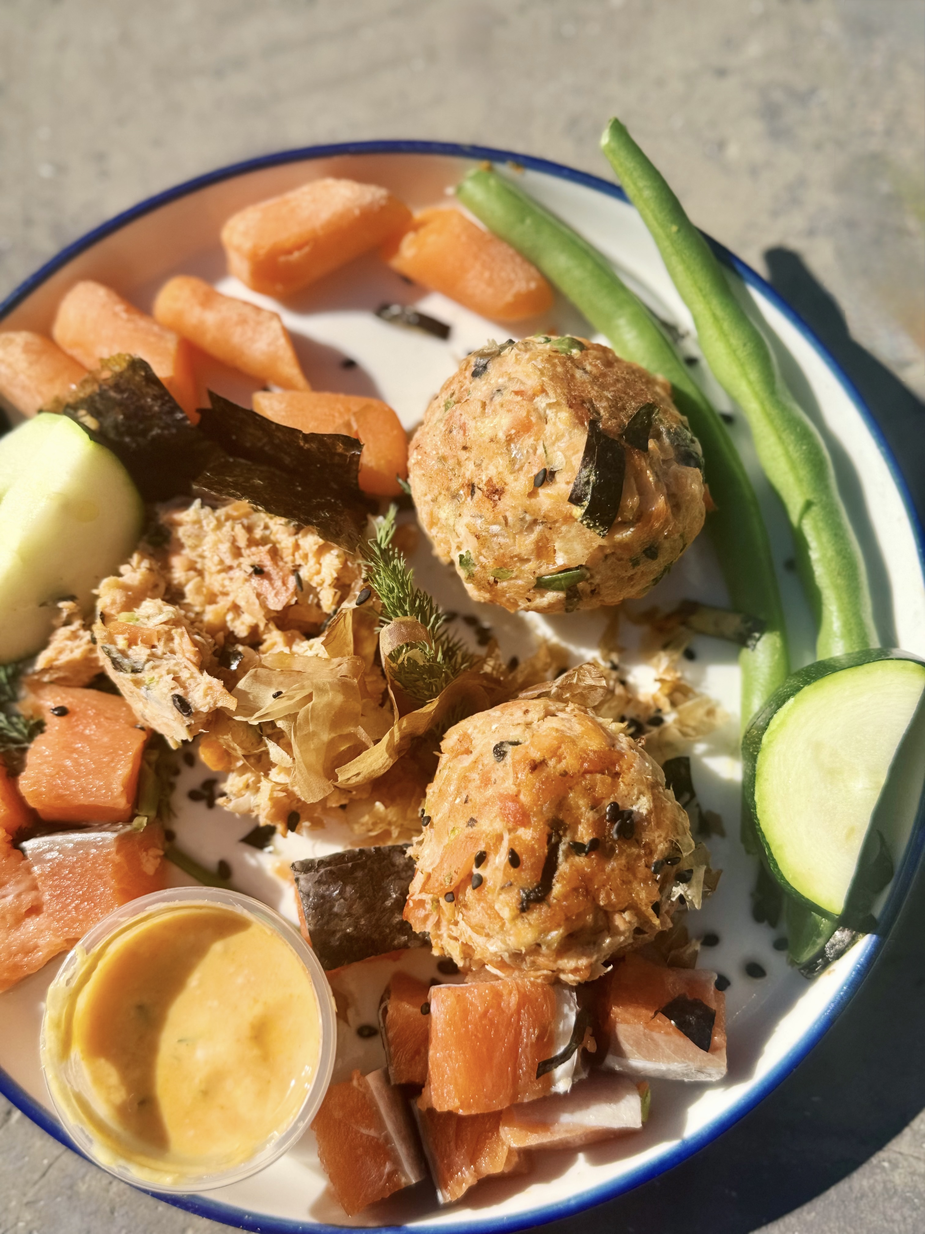 Ingredients: Wild-caught salmon, organic carrots, organic eggs, organic green beans, organic zucchini, organic broccoli, organic kale, organic black sesame seeds, organic parsley, organic dill, organic seaweed, bonito flakes. "Spicy" mayo dipping sauce: organic low-fat lactose free yogurt, organic turmeric, organic beet juice.